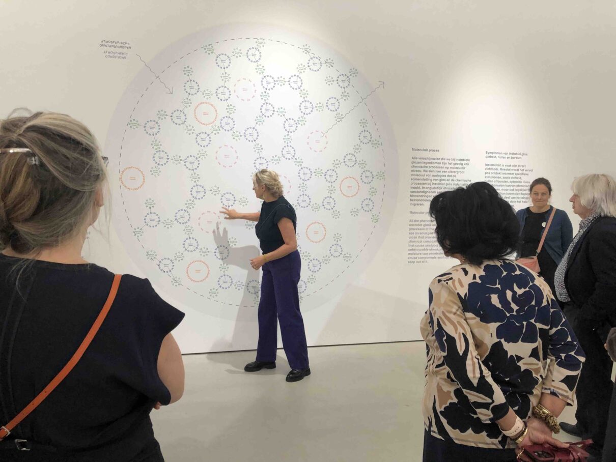 Om meer grip te krijgen op glasdegradatie n.a.v. instabiliteit en om de eigen collectie beter te kunnen volgen en conserveren, is het Boijmans 20 jaar geleden begonnen met een groot en langlopend onderzoeksproject. Binnen dit project wordt samengewerkt met externe onderzoekers (waaronder Mandy Slager) en de Rijksdienst voor Cultureel Erfgoed (RCE). Met behulp van analytische onderzoeksmethodes wordt onderzoek gedaan naar de samenstelling van het glas, de samenstelling van de producten die uitlogen en de snelheid van het degradatieproces. Alle informatie wordt vergeleken met informatie uit eerdere onderzoeken en met data van andere collecties, waardoor er langzaam steeds een beetje meer wordt begrepen van dit ingewikkelde degradatiefenomeen. Wij hebben in ieder geval onze kans schoon gezien om Nora en Mandy het hemd van het lijf te vragen en we hebben veel geleerd over instabiel glas en glasdegradatie.